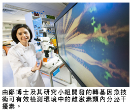 生物及化學系副系主任鄭淑嫻博士領導的研究小組成功培育出一種轉基因鯖鱂魚,能發出不同強度的綠色螢光來反映雌激素活性水平。