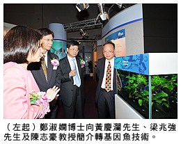這次展出的轉基因魚是城大在環境研究上的成果之一。「我們希望透過展覽增加公眾對雌激素類污染的認識,為保護環境盡一點力,」陳教授說。