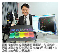 「目前的熒光生物探針和生物成像試劑主要是有機染料。大眾普遍認為過渡金屬配合物毒性較強,因此不適用於生物應用,尤其是在活體中的應用。」羅教授說:「我們的研究團隊可以調控這些配合物的生物毒性。研究結果也表明,發光性過渡金屬配合物擁有較長的發光壽命、較高的光穩定性,以及極低的自猝滅特質,因此在檢測生物分子和活細胞及動物成像方面,有很大應用潛力。