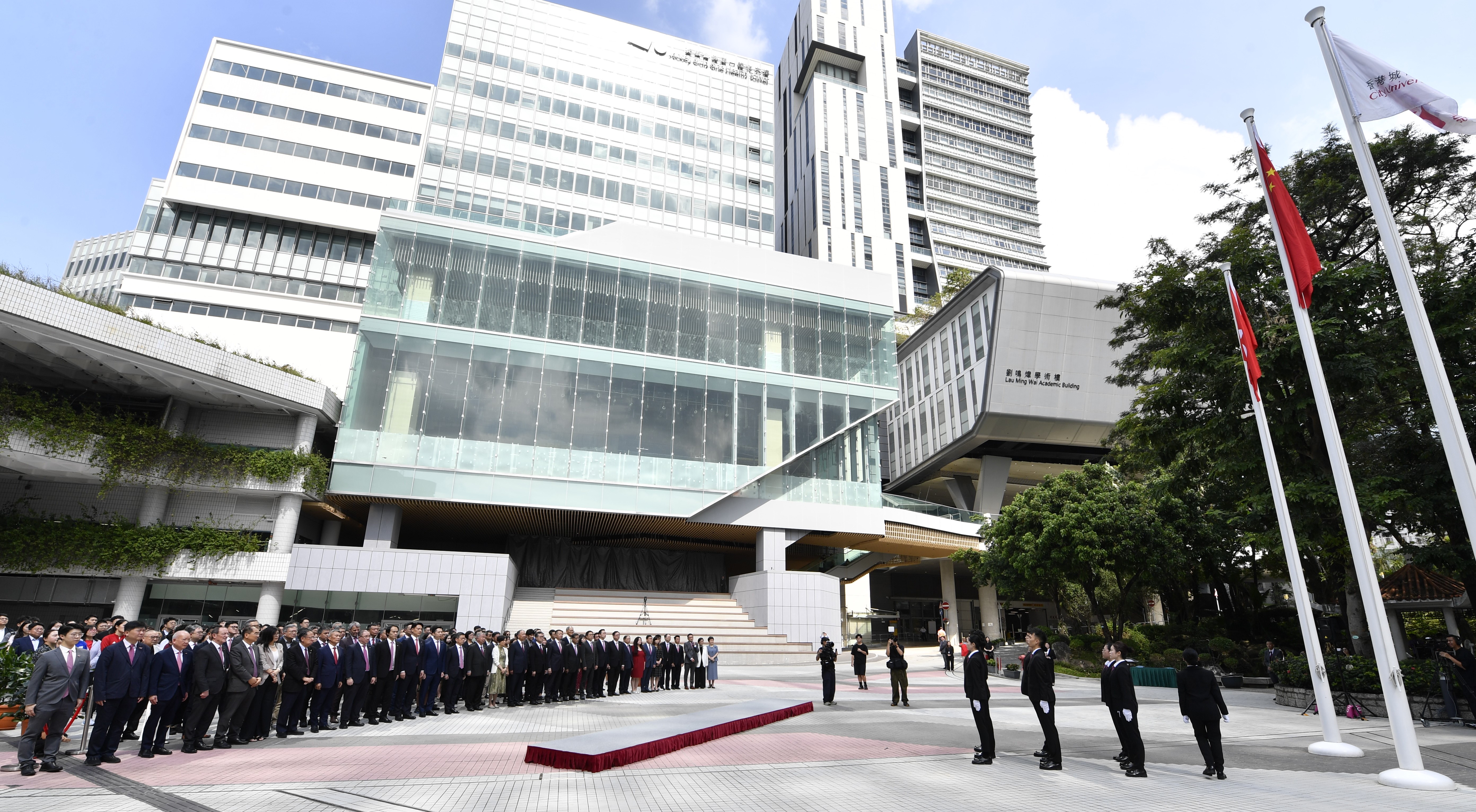 儀式今早在城大廣場舉行,中華人民共和國香港特別行政區政府教育局副局長施俊輝博士、城大校董會副監督鍾瑞明博士、主席魏明德先生、副主席蔣瑞福女士、司庫錢應安先生,以及校長及大學傑出教授梅彥昌教授,與城大校董會成員、顧問委員會成員、基金理事會成員、教職員、學生、校友等約200位大學成員出席儀式。校董會主席魏先生及梅校長主持典禮。