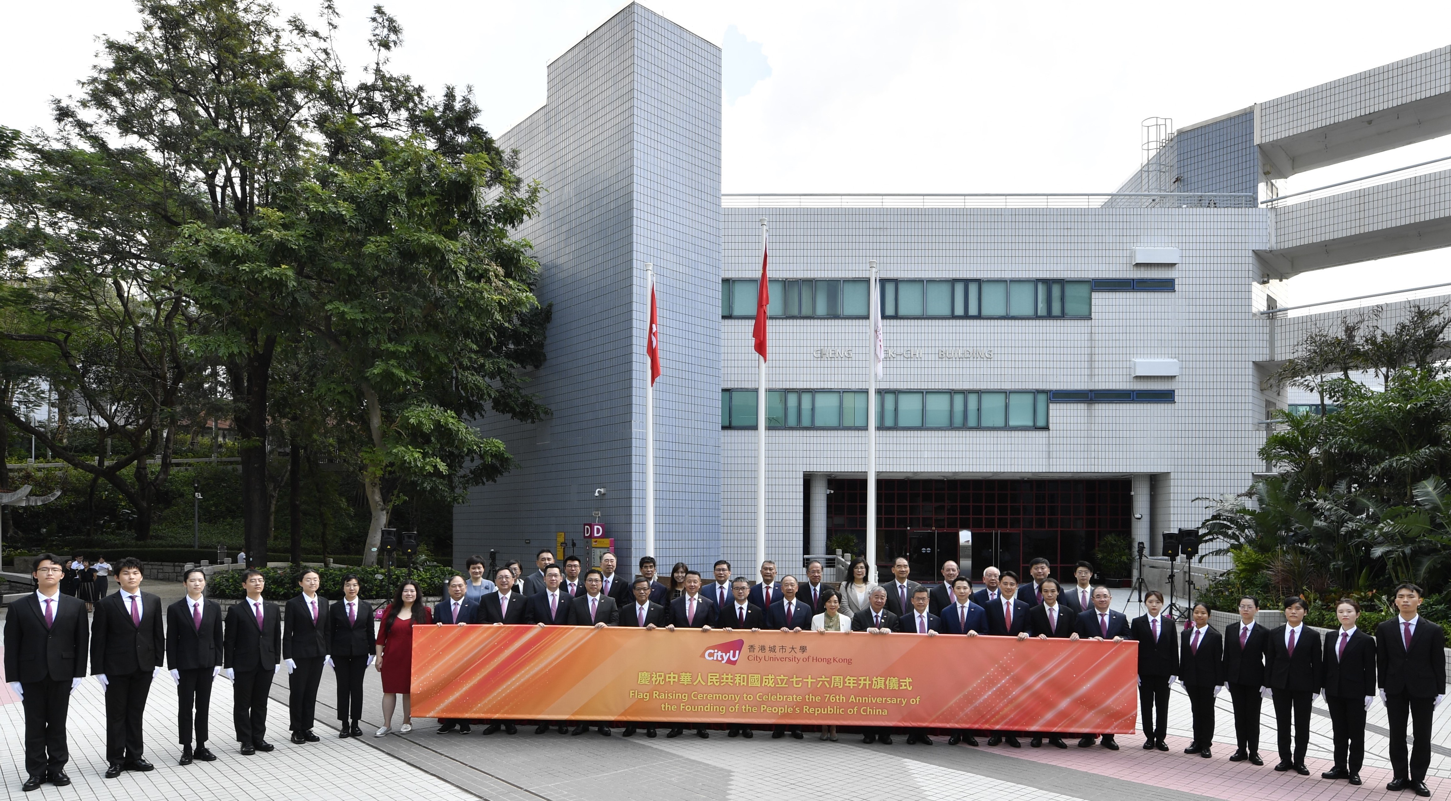 由城大組成的護旗隊在儀式中負責升掛中華人民共和國國旗、香港特別行政區區旗及城大校旗。儀式讓一眾嘉賓與城大社群共同慶祝國慶日,並勉勵師生積極把握國家發展機遇,助力國家的未來發展。