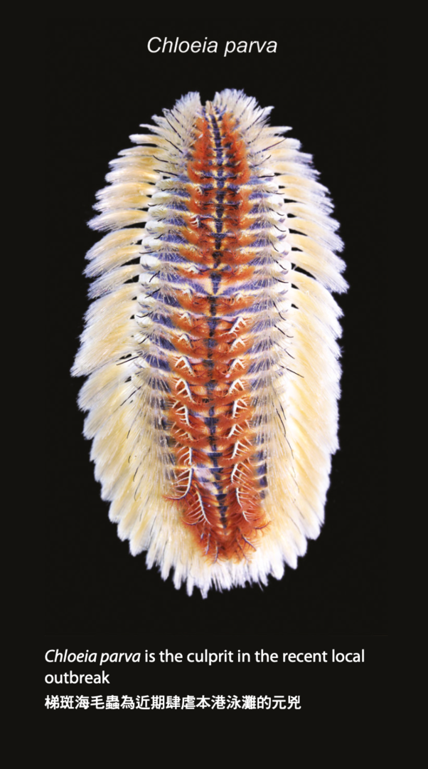 至於在爆發期間,團隊從荃灣兩個泳灘及吐露港的淺海水域收集到的海毛蟲樣本,翻查大量文獻,逐一比對27種海毛蟲圖片及樣本,並進行DNA序列比對,邱教授團隊發現樣本為1868年命名的「梯斑海毛蟲」。與雙斑海毛蟲不同,該物種每個體節背部的中央均有一個深色的Y形斑紋標記。團隊更在解剖後,詳盡描述是次發現的物種特徵,豐富了該物種的形態特徵記錄。